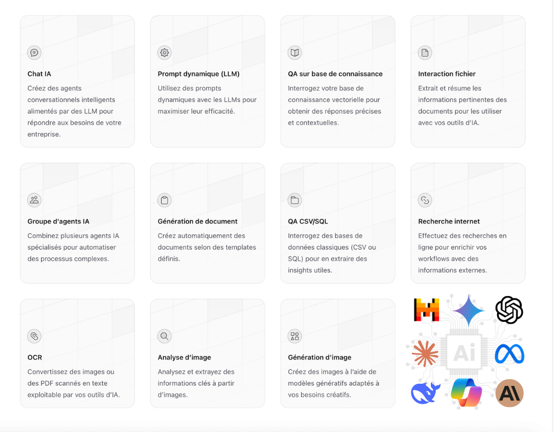 Intégration d’applications avec des connecteurs personnalisés , accès à des services tiers par API (CRM, ERP, LLM privé...).
