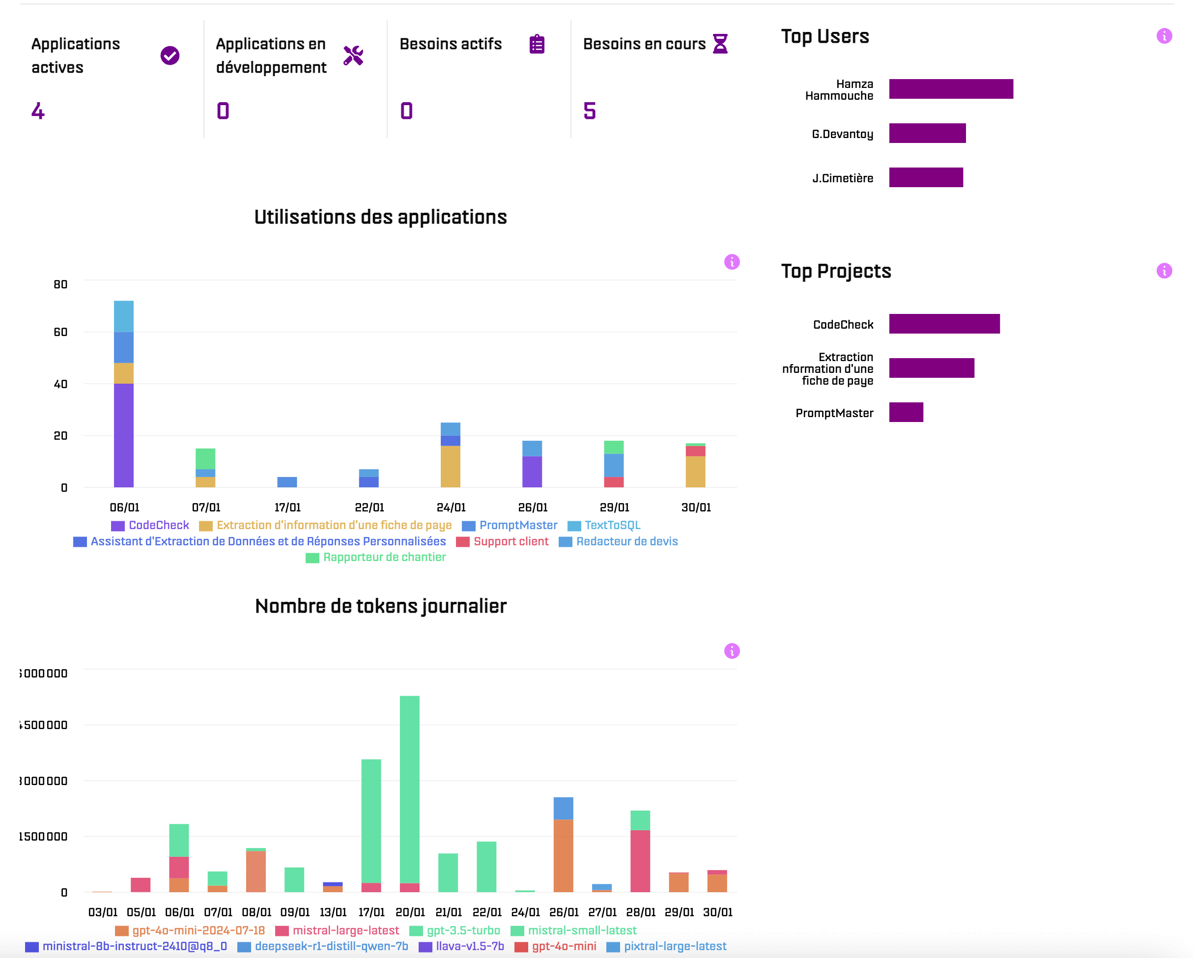Historique d’utilisation pour chaque outil, gestion des tâches en cours et suivi des coûts IA par modèle.